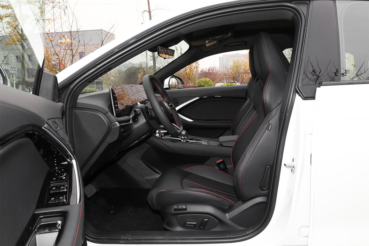 Inside, the cabin combines sporty aesthetics with modern technology. A driver-focused cockpit houses a digital instrument cluster and a large touchscreen infotainment system, complemented by premium materials and supportive seating.